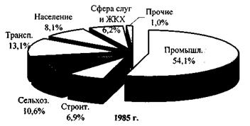 Муниципальные образования имеют весьма разную структуру хозяйства. Во многих случаях коммунальное потребление энергоресурсов отнесено на промышленность. Наблюдаются случаи, когда учет энергопотребления осуществляется по месту регистрации предприятия, в то время как производственные подразделения его находятся в других муниципальных образованиях (г. Стрежевой). С недостаточной достоверностью в сельских районах учитывается потребление прочих энергоресурсов, и в частности дров. Сопоставление структуры потребления энергоресурсов в отраслевых комплексах в 1985 и 2000 годах показывает существенное снижение (на порядок) потребления энергоресурсов в строительстве, сельском хозяйстве (втрое), транспорте (вдвое) и жилищно-коммунальном хозяйстве (рис.6). Увеличение потребления энергоресурсов населением до 22 % от суммарного свидетельствует о двух явлениях: - во-первых, при снижении энергопотребления в других отраслевых комплексах доля потребления населением повышается; - во-вторых, малый бизнес в значительно большей степени, чем ранее, использует электроэнергию и тепло для малых производственных нужд, тем более, что плата по категории «население» значительно ниже, чем по категории «промышленность».