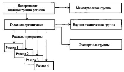 Рис. 2. Схема управления разработкой программы Для разработки программы постановлением администрации назначается головная организация по разработке программы, определяется порядок ее работы и финансирования. При головной организации формируется научно-техническая группа специалистов, которая занимается разработкой программы, осуществляет координацию работ, выполняемых отдельными экспертными группами, организует экспертизу и обобщение предложений, подаваемых для включения в программу. В программе энергосбережения выделены следующие разделы: Правовое и финансовое обеспечение программы. Оно включает Законы - «Об основах энергосбережения» и «Об обеспечении потребителей тепловой и электрической энергией», «Положение о региональном рынке энергии», пакет Постановлений областной администрации о финансовых и экономических механизмах программы, о метрологическом обеспечении, сертификации и аттестации, о введении энергетических обследований, о мониторинге инженерных сетей, зданий и конструкций, о тарифной политике и оснащении средствами учета, контроля и управления потреблением энергоресурсов, о подготовке, переподготовке и повышении квалификации кадров, о борьбе с расточительным использованием и хищениями энергоресурсов, об органах управления разработкой и реализацией программы и др. Формирование общественного сознания по проблемам энергосбережения. Здесь дается описание рекламной кампании в средствах массовой информации, которая должна постепенно, но достаточно быстро сформировать в сознании населения области, рабочих и служащих, домохозяек и студентов, школьников и пенсионеров, руководителей промышленности и бизнесменов энергосберегающее поведение. Комплекс перспективных мероприятий. В этом разделе дается краткая характеристика проектов по энергосбережению, предложенных предприятиями, научными учреждениями и авторскими коллективами. Мероприятия сгруппированы по виду энергоресурса: электроэнергия, тепловая энергия, газ, нефть и нефтепродукты, уголь и торф, строительство, вода, альтернативные источники энергии. Комплекс первоочередных мероприятий включает быстрореализуемые и эффективные мероприятия, не требующие значительных финансовых затрат. К их числу отнесены: • энергетические обследования, внедрение средств и систем учета, контроля и регулирования использования энергоресурсов; • мероприятия по формированию общественного сознания по проблемам энергосбережения и др.