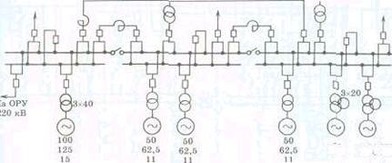 Рис. 5.1. Главная схема электрических соединений Зуевской ГРЭС Донбассэнерго. Это в полной мере относится к современным мощным КЭС, ГЭС и АЭС. Но на ТЭЦ с агрегатами менее 100 МВт распредустройство генераторного напряжения сохранилось, прежде всего, потому, что от него питаются местная нагрузка и трансформаторы собственных нужд станции. При этом для ограничения токов КЗ широко применяются токоограничивающие реакторы, а шины генераторного напряжения многократно секционируются (в отдельных случаях замыкаются в кольцо). Надо отметить, что широко распространенные токоограничивающие реакторы были созданы еще в 30-е годы XX в. и до последнего времени служат основным средством, обеспечивающим устойчивую работу оборудования электростанций при КЗ. Неоднократно предпринимались попытки внедрить токоограничивающие устройства иного вида (нелинейные, резонансные схемы и т.п.) или создать выключатели, способные отключать КЗ до достижения токами КЗ опасных значений — в самом начале аварийного переходного процесса. Однако до сих пор такие устройства не нашли широкого применения либо по причине их недостаточной технической эффективности, либо из-за большой стоимости. В свою очередь токоограничивающие реакторы в последнее время вызвали в России интерес в связи с применением магнитного бетона — магнитного диэлектрика — для повышения индуктивности реактора. Но внедрение таких реакторов пока находится в самом начале, и лишь практика покажет, насколько они эффективны. На мощных электростанциях перспективной оказалась схема блока генератор—трансформатор с подключением на генераторном напряжении трансформатора собственных нужд блока. Уже несколько десятилетий широко применяется подключение двух генераторов к одному трансформатору с расщепленными обмотками низшего напряжения, если это допускает мощность повышающего трансформатора (схема весьма распространенная на ГЭС). Развитие схем распределительных устройств на повышенном напряжении определялось следующими факторами: сохранение блока генератор—трансформатор при повреждении выключателя или системы шин; возможность вывода в ремонт выключателя без потери блока; надежность работы в ремонтных режимах; возможность маневрировать выдачей мощности. Наконец, далеко не последняя по значимости совместная структура электрической сети системы, в которую выдает мощность электростанция: число линий, их связь с разными потребителями и узловыми подстанциями и другие факторы, определяющие режимы системы, наличие в ней резервов мощности и способность обеспечить аварийное покрытие потребности, как по мощности, так и по пропускной способности сети. Для сохранения блока при повреждении выключателя в СШЛ на ранних этапах развивалась схема подключения трансформатора блока к двойной системе шин через развилку из двух выключателей (эту схему так и называют американской). Другое, хотя и не эквивалентное этому решение даст схема с двумя рабочими и третьей обходной системами шин и с одним обходным выключателем (рис. 5.2). Это решение оказалось весьма жизнеспособным. При повреждении выключателя блок отключается на короткий промежуток времени, необходимый для включения обходной электрической цепи через обходную систему шин. Проблема кратковременной потери блоков при аварии на одной систе