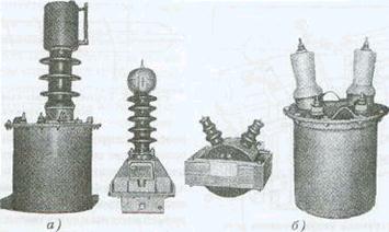 Рис. 6.17, Однофазные измерительные трансформаторы напряжении а — типа ЗНОМ-35 конструкции 1954 и 1966 гг.; б— типа НОКЭ-10 с литой изоляцией на эпоксидной смоле и типа НОМ-10