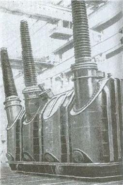 Большая работа проведена по освоению холоднокатаной текстурованной электротехнической стали, имеющей более низкие удельные потери и намагничивающую мощность, что позволило значительно снизить потери и массу активной стали и масла. В 1956—1957 гг. на «Армэлектрозаподе» (Армения) при участии МЭЗ была спроектирована серия трансформаторов мощностью до 560 кВ • А на напряжение 6 и 10 кВ, в которой на базе применения холоднокатаной стали снижены потери в сравнении с аналогичными ранее выпускавшимися трансформаторами и на 20—30 % уменьшены масса активной стали и масла. В 1949 г. на МЭЗ возобновились исследовательские и конструкторские работы по созданию трансформаторного оборудования на напряжение 400 кВ. Над этой проблемой работали также инженеры ЗТЗ и ВЭИ. Весь комплекс трансформаторного оборудования на напряжение 400 кВ — в то время самого высокого в мире рабочего напряжения электропередачи — был создан на основе исследований, выполненных отечественными инженерами и учеными. В комплекс входили трансформаторы на 400 кВ, агрегаты для регулирования под нагрузкой, шунтирующие реакторы для компенсации емкостных токов в линии на напряжение 400 кВ (рис- 6. 18).