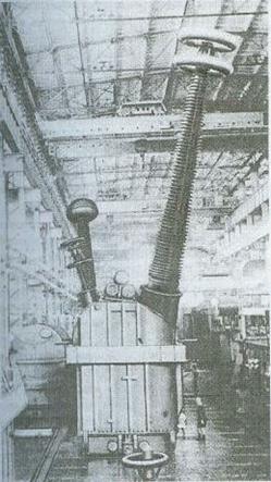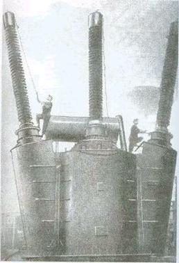 В 1935—1940 гг. были разработаны и освоены конструкции сложных трансформаторов мощностью до 31 500 кВ • А с регулированием напряжения под нагрузкой; трансформаторов мощностью до 15 000 кВ ∙А с вторичными токами до 70 кА для питания электрических печей; измерительных трансформаторов напряжения на рабочее напряжение 220 кВ, выполненных каскадными в фарфоровых чехлах; испытательных трансформаторов на 500 кВ. Обширные комплексные исследования проводились МЭЗ в тесном содружестве с Всесоюзным электротехническим институтом (ВЭИ). Большой научно-технический вклад в разработку теоретических и практических вопросов трансформаторостроения внесли в этот период Г.В, Алексенко, Н.И. Булгаков, Б.Б. Гельперин, Э.А. Манькин, Г.Н. Петров, А.В. Сапожников и др. На основе систематических исследований в области изоляции и перенапряжений была предложена и внедрена в 1938—1939 гг. емкостная система защиты обмоток напряжением 110—220 кВ, позволившая обеспечить импульсную прочность обмоток при атмосферных перенапряжениях. За разработку и внедрение в производство конструкций ряда трансформаторов группа инженеров МЭЗ была удостоена Государственной премии. В тяжелые годы Великой Отечественной войны трансформаторостроение продолжало развиваться, хотя и более медленными темпами. Трансформаторы выпускались в основном на МЭЗ и свердловском заводе «Уралэлектроаппарат». В первые послевоенные годы количественный выпуск трансформаторов в СССР быстро достиг довоенного уровня, при этом повышался технический уровень трансформаторного оборудования, совершенствовалась конструкция, росли предельные мощности и напряжения, создавались новые виды трансформаторов и реакторов, разрабатывались серии, превосходившие довоенные по технико-экономическим показателям. В военные и первые послевоенные годы были разработаны конструкции большинства типов измерительных трансформаторов напряжения в широком диапазоне классов напряжения — от 6 до 220 кВ, (рис. 6,17). В 1949 г. был выпущен первый трансформатор на крупнейшем Запорожском трансформаторном заводе (ЗТЗ); в 1960 г, первую продукцию выпустил Тольяттинский электротехнический завод; расширялись МЭЗ и завод «Уралэлектротяжмаш». В 50—60-е годы созданы новые заводы по производству трансформаторов на Кавказе, в Средней Азии, на Дальнем Востоке, Украине и в Белоруссии. Совершенствование трансформаторного оборудования осуществлялось на основе теоретических, научно-технических и прикладных исследований ведущих электротехников и энергетиков страны: Ю.Б. Бородулина, А.Г. Крайза, В.А. Трапезникова, П.М. Тихомирова. Л.М, Шницера и др. В этот же период начался переход к широкому внедрению трехфазных трансформаторов с высшим напряжением 110 кВ и более взамен групп из трех однофазных. Трехфазные трансформаторы имели более низкие потери, это позволило достичь также экономии материалов, удешевить сооружения подстанций, снизить расходы на перевозку и монтаж.
