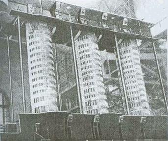 Рис 6.24. Однофазный шунтирующий реактор мощностью 55 Мвар на напряжение 500 кВ конструкции 1966 г. (без сердечника, с наружной магнитной системой, охватывающей обмотку)