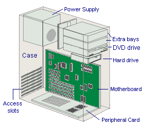 While you may not often tinker with the insides of your computer, it is a good idea to know a little about what it is like in there. The diagram below shows a basic arrangement but uses a large case to make it easier to see the parts. Your computer likely has several more internal devices than the illustration shows. Plus, all of the buttons, lights, and ports on the front of the case must connect to the motherboard inside. The first task is to remove the case so we can see what's inside. Click on the label 'Case' to start with.