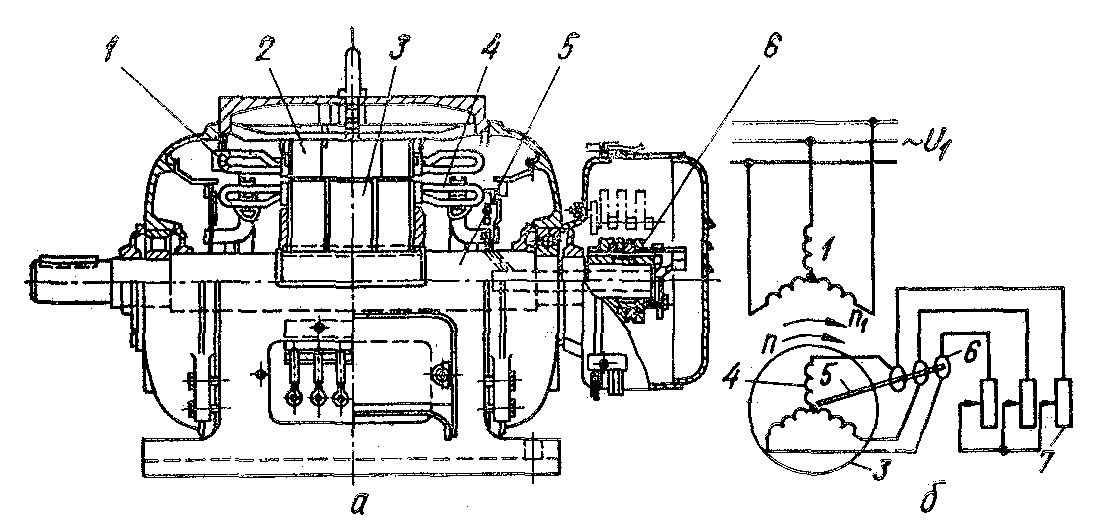 За конструкцією асинхронні машини поділяють на два основних типи: з фазним ротором (з контактними кільцями і короткозамкненим ротором; їх статори конструктивно однакові. Осердя статорів і роторів набирають з листів електротехнічної сталі, у виштомпованих пазах яких вкладають обмотки, що мають однакову кількість полюсів. Машина з фазним ротором (рис. 11.1). Трифазна обмотка статора і укладена в пазах його осердя 2. На роторі З укладена аналогічна обмотка 4, яка звичайно з'єднана зіркою, а її виводи під'єднані до контактних кілець б, що насаджені на вал машини.5. По кільцях ковзають щітки, за допомогою яких в коло ротора можна включити резисторі 7.