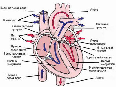 Внутри сердце разделено перегородками на четыре камеры. Два предсердия разделены межпредсердной перегородкой на левое и правое предсердия. Левый и правый желудочки сердца разделены межжелудочковой перегородкой. В норме левые и правые отделы сердца абсолютно раздельны. У предсердий и желудочков разные функции. В предсердиях накапливается кровь, поступающая в сердце. Когда объем этой крови достаточен, она проталкивается в желудочки. А желудочки проталкивают кровь в артерии, по всему организму. Желудочкам приходится выполнять более тяжелую работу, поэтому мышечный слой в желудочках значительно толще, чем в предсердиях. Предсердия и желудочки с каждой стороны сердца соединяются предсердно-желудочковым отверстием. Кровь через сердце движется только в одном направлении. По большому кругу кровообращения из левой части сердца (левого предсердия и левого желудочка) в правую, а по малому из правой в левую. Правильное направление обеспечивает клапанный аппаратсердца: трехстворчатый, легочный, двустворчатый или митральный, аортальный клапаны. Они открываются в нужный момент и закрываются, препятствуя кровотоку в обратном направлении. Трехстворчатый клапан. Он расположен между правым предсердием и правым желудочком. Он состоит из трех створок. Если клапан открыт, кровь переходит из правого предсердия в правый желудочек. Когда желудочек наполняется, мышца его сокращается и под действием давления крови клапан закрывается, препятствуя обратному току крови в предсердие. Легочный клапан. При закрытом трехстворчатом клапане выход крови в правом желудочке возможен только через легочной ствол в легочные артерии. Легочный клапан расположен на входе в легочный ствол. Он открывается под давлением крови при сокращении правого желудочка, кровь поступает в легочные артерии, затем под действием обратного тока крови при расслаблении правого желудочка он закрывается, препятствуя обратному поступлению крови из легочного ствола в правый желудочек. Двустворчатый или митральный клапан. Находится между левым предсердием и левым желудочком. Состоит из двух створок. Если он открыт, кровь поступает из левого предсердия в левый желудочек, при сокращении левого желудочка он закрывается, препятствуя обратному току крови. Аортальный клапан. Закрывает вход в аорту. Тоже состоит из трех створок, которые имеют вид полулуний. Открывается при сокращении левого желудочка. При этом кровь поступает в аорту. При расслаблении левого желудочка, закрывается. Таким образом, венозная кровь (бедная кислородом) из верхней и нижней полой вен попадает в правое предсердие. При сокращении правого предсердия через трехстворчатый клапан она продвигается в правый желудочек. Сокращаясь, правый желудочек выбрасывает кровь через легочной клапан в легочные артерии (малый круг кровообращения). Обогащаясь кислородом в легких кровь превращается в артериальную и по легочным венам продвигается в левое предсердие, затем в левый желудочек. При сокращении левого желудочка артериальная кровь через аортальный клапан под большим давлением попадает в аорту и разносится по всему организму (большой круг кровообращения).