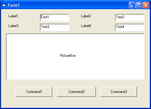 На форме (Form1) размещены следующие объекты: Label1, Label2, Label3, Label4 - метки Label; Text1, Text2, Text3, Text4 - текстовые окна TextBox; Command1, Command2, Command3 - командные кнопки Command; PictureBox - графическое окно PictureBox.