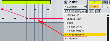 Для сохранения миди клипа в MIDI файл, сначала выберите его в главном окне программы (к примеру как на рисунке выше). После этого выберите пункт 6 Export MIDI clip (самый верхний рисунок). Для того чтобы автоматизировать нужный параметр, измените его значение (покрутите) и вы увидите, что данном треке появилась красная полоска, это линия автоматизации данного параметра.