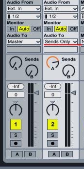 Дорожку возврата можно создать, используя команду «Insert Return Track» в меню «Create». На дорожках в микшере имеется блок «Sends», в котором отображаются регуляторы (в виде сессии — кнобы), отмеченные буквами «A», «B» и т.д., с помощью которых можно регулировать количество сигнала, поступающего в различные дорожки возвратов. Таким же способом можно посылать сигнал с одного возврата на другой. Дорожка возврата имеет все те же свойства, что и обычные дорожки. Кроме того имеется кнопка «Pre/Post» (обведена красным цветом на рис. выше). Данная кнопка определяет то, как на данную дорожку будут посылаться другие: «Pre» - минуются обработки посылающей дорожки; «Post» - обработки посылающей дорожки учитываются. Для того, чтобы послать определённый дорожку на дорожку возврата, нужно увеличить значения в обведённых на рисунке ниже полях или кнобах в блоке «Sends» в режиме сессии.