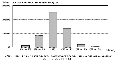 Входное напряжение из диапазона + 5 В было установлено по возможности ближе к центру кода. Как видно из гистограммы, все результаты преобразований распределены на шесть кодов. Среднеквадратическое значение шума, соответствующее этой гистограмме, равно 120 мкВ.