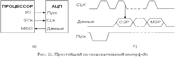 Здесь приведена схема, реализующая SPI-интерфейс. Процессор является ведущим (master). Он инициирует начало процесса преобразования подачей среза на вход "Пуск" АЦП. С тактового выхода процессора на синхровход АЦП поступает последовательность тактовых импульсов. Начиная со второго такта после пуска на выходе данных АЦП формируется последовательный код выходного слова старшими битами вперед. Этот сигнал поступает на MISO (master - input, slave - output) вход процессора. Простейший интерфейс обеспечивает наименьшее время цикла "преобразование - передача данных". Однако он обладает двумя существенными недостатками. Во-первых, переключение выходных каскадов АЦП во время преобразования привносит импульсную помеху в аналоговую часть преобразователя, что вызывает уменьшение соотношение сигнал/шум (например, для АЦП AD7893 среднеквадратическое значение шума при передаче данных во время преобразования почти в три раза больше, чем при считывании данных после преобразования). Во-вторых, если АЦП имеет большое время преобразования, то процессор будет занят приемом информации от него существенную часть вычислительного цикла. По этим причинам современные модели АЦП с последовательной передачей выходных данных оснащаются выходным сдвиговым регистром, в который загружается результат преобразования из РПП. Временные диаграммы такого интерфейса приведены на рис. 22.