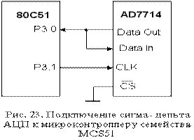 По заднему фронту сигнала "Пуск" УВХ переходит в режим хранения и начинается преобразование. При этом на соответствующем выводе АЦП выставляется сигнал "Занят". По окончании преобразования начинается передача данных. Процессор подает на синхровход АЦП последовательность синхроимпульсов CLK. Если 8<N <=16, то число синхроимпульсов обычно составляет 16. При N<16 вначале вместо отсутствующих старших битов передаются нули, а затем выходное слово старшими битами вперед. До и после передачи данных выходная линия АЦП находится в высокоимпедансном состоянии. Увеличение длительности цикла "преобразование - передача данных" по сравнению с простейшим интерфейсом обычно несущественно, так как синхроимпульсы могут иметь большую частоту. Например, для 12-разрядного АЦП последовательного приближения AD7896 минимальный интервал между отсчетами составляет 10 мкс. Из них последовательное чтение данных занимает только 1,6 мкс при частоте синхросигнала 10 МГц. Последовательный интерфейс сигма-дельта АЦП с процессорами аппаратно реализуется очень просто. Например, для связи 24-разрядного трехканального АЦП AD7714 с микроконтроллером 80С51 в простейшем случае требуется всего две линии (рис. 23).