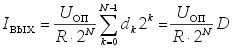 в соответствии с рис.4. Поскольку в любом положении переключателей Sk они соединяют нижние выводы резисторов с общей шиной схемы, источник опорного напряжения нагружен на постоянное входное сопротивление Rвх=R. Это гарантирует неизменность опорного напряжения при любом входном коде ЦАП. Согласно рис. 4, выходные токи схемы определяются соотношениями