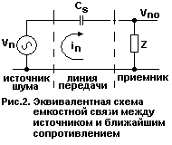 Влияние через паразитную емкость может смоделировано, как показано на рис. 2. Здесь Vn– источник помех (переключающий транзистор, логический элемент и т.п.), Cs – паразитная емкость, Z – входной импеданс приемника (например, резистор, включенный между входом усилителя и общим проводом) и Vno – выходной шум, возникающий на сопротивлении Z.