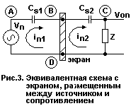 При добавлении экрана распределение токов (рис. 2) изменяется, что проиллюстрировано на рис. 3. Предполагая, что импеданс экрана равен нулю, шумовой ток в контуре A-B-D-A будет равен Vn/ZCs1, а в контуре D-B-C-D этот ток будет отсутствовать, поскольку там нет источника помех. И, следовательно, на сопротивлении Z не будет присутствовать напряжение шумов, а чувствительные элементы схемы будут защищены экраном от помех.
