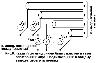 · Количество отдельных экранов, требующихся в устойстве, должно быть равно количеству независимых измеряемых сигналов. Каждый сигнал должен иметь свой собственный экран, не соединенный с другими экранами устройства, кроме как в объединенной точке общих выводов источников (сигнальная земля). Если в схеме присутствуют несколько сигнальных земель, то каждый экран должен быть подключен к опорному потенциалу своего источника (рис. 6).