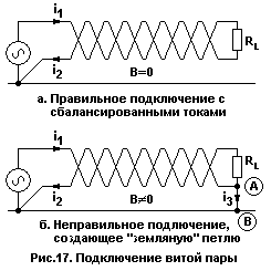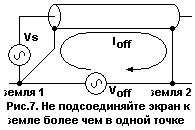 · Не подсоединяйте оба конца оплетки к земле. Разность потенциалов между двумя землями вызовет протекание дополнительного тока по экрану (рис. 7). Этот ток будет создавать шумовое напряжение в центральном проводнике посредством магнитного взаимодействия.