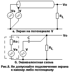 · Не допускайте протекания тока по экрану (за исключением случая, описанного далее). Протекающий по экрану ток будет наводить паразитные сигналы на центральный проводник. · Не подавайте на экран напряжение относительно опорного потенциала источника (исключение составляет случай защитного экранирования, описанный далее). Потенциал экрана V будет взаимодействовать с центральным проводником посредством емкостной связи и создавать помехи (рис. 8).
