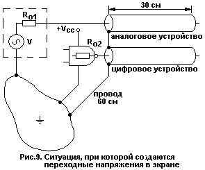 Рассмотрим схему с ошибочно созданным экраном, в которой прецизионный источник напряжения V и логический элемент совместно используют подключение к экрану. Этот случай может возникнуть в больших системах, где аналоговые и цифровые сигналы передаются вместе. Изменение напряжения на выходе логической схемы взаимодействует с экраном через емкостную связь, создавая возвратный ток в проводнике длиной 60 см. Это, в свою очередь, создает напряжение на экране, который является общим для цифровой и аналоговой частей схемы. Эквивалентная схема такого соединения приведена на рисунке 10, где V(t) – пятивольтовое изменение выходного напряжения логического элемента, Ro2 – его выходной импеданс, CWS – емкость экранированного кабеля, RS и LS – сопротивление и индуктивность провода, соединяющего экран с землей.