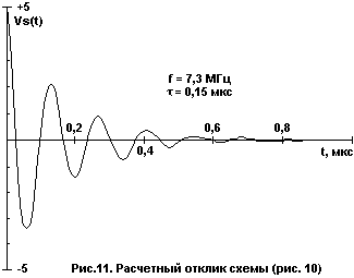 Напряжение на экране VS(t) может быть рассчитано традиционными аналитическими методами или аккуратно измерено в реальной схеме с приведенными на рисунках параметрами. На рисунке 11 продемонстрирован отклик схемы на скачок напряжения в 5 вольт (резонансная частота – 7,3 МГц, постоянная времени затухания – 0,15 мкс). Это напряжение возникает на экране и взаимодействует посредством емкостной связи с аналоговым входом.