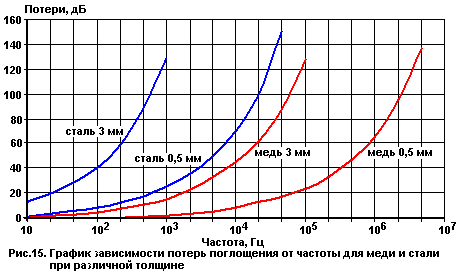 Графики, приведенные на рисунке 15, позволяют сравнить потери при поглощении магнитного поля для стали и меди при двух значениях толщины экрана. Трехмиллиметровый стальной экран достаточно эффективен на частотах выше 200 Гц, а полумиллиметровый медный экран хорошо работает на частотах выше 1 МГц. Слабое место экранирования проявляется на более низких частотах, включая 50-60 Гц сетевого напряжения – основной источник наводок, связанный с влиянием магнитного поля.