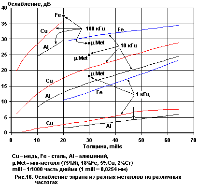 Если необходимо качественное экранирование низкочастотного магнитного поля, то в качестве материала экрана используется металл с высокой магнитной проницаемостью (так называемый µ-металл). На рисунке 16 приведены графики зависимости ослабления магнитного поля от толщины при разных частотах. Из этих графиков видно, что на частотах ниже 1 кГц µ-металл более эффективен, чем другие материалы, а на частоте 100 кГц – менее. К сожалению, при использовании µ-металла возникают некоторые сложности – после насыщения под воздействием очень сильного поля экран из µ-металла теряет свои положительные качества.