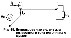 Соединение между точками A и B приведет к несбалансированности токов протекающих по проводникам витой пары. По этой же причине витую пару следует располагать над земляным полигоном, возможно ближе к нему, для уравнивания емкостной связи между каждым из проводников и полигоном и уменьшения площади контура. · Используйте экранированный провод для передачи большого переменного тока, используя оплетку как проводник возвратного тока (рис. 18). Если ток экрана i2 равен по величине, но противоположен по направлению току центрального проводника i1, то поля создаваемые этими токами будут взаимно компенсировать друг друга. В этом случае, который, как может показаться, вступает в противоречие с правилом отсутствия тока, протекающего по экрану, для экранирования центрального проводника не обязательно использовать строго концентрический кабель.