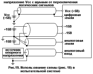 Такое подключение может быть полезным при создании систем автоматического испытательного оборудования, где точные измерения производятся устройствами, потребляющими большие токи, которые могут быть недостаточно чистыми. На рисунке 19 приведен пример, показывающий применение этого способа подключения питания логической части измерительной схемы.