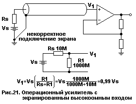 Если происходит перемещение проводников (например, при выявлении неисправностей), площадь контура и его ориентация относительно поля может измениться, а приемлемый вчера уровень шума завтра может оказаться повышенным. Определяйте контуры и их ориентации, делайте то, что должно быть сделано для минимизации шума и надолго сохраняйте разводку проводов. Управление экранами и защита Мы обсудили роль экрана, по которому течет ток, равный по величине, но противоположный по направлению току центрального проводника. При этом магнитные поля компенсируют друг друга. Защита создается достаточно просто: потенциал на экране задается от источника с низким выходным импедансом; этот потенциал должен быть практически таким же, что и потенциал экранируемого сигнала, т.е. сигнальное и экранное напряжения синфазны и равны. Защита имеет много положительных качеств: она уменьшает синфазную емкость (поскольку потенциалы сигнала и экрана одинаковы), улучшает подавление синфазной составляющей и уменьшает токи утечки в высокоомных схемах.