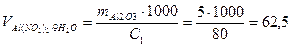 Для приготування розчину беремо наважку кристалогідрату 58,4 г, кількісно переносимо в колбу на 100 см3, доводимо до мітки дистильованою водою. Для отримання оксиду відберемо розрахований об’єм, тобто 62,5 см3. Об'єм розчину гідроксиду амонію V2, см³, можна орієнтовно розрахувати згідно з реакцією 4.1.