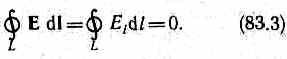 Интеграл называется циркуляцией вектора напряженности. Следовательно, циркуляция вектора напряженности электростатического поля вдоль любого замкнутого контура равна нулю. Силовое поле, обладающее свойством (83.3), называется потенциальным. Из обращения в нуль циркуляции вектора Е следует, что линии напряженности электростатического поля не могут быть замкнутыми, они начинаются и кончаются на зарядах (соответственно на положительных или отрицательных) или же уходят в бесконечность. Формула (83.3) справедлива только для электростатического поля. В дальнейшем будет показано, что для поля движущихся зарядов условие (83.3) не выполняется (для него циркуляция вектора напряженности отлична от нуля).
