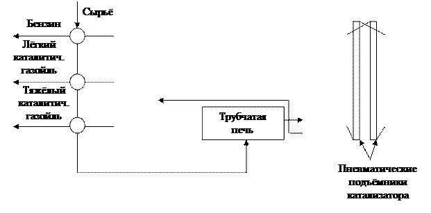 Процесс расщепления молекул тяжёлых углеводородов называют крекингом. Крекинг осуществляют путём нагрева обрабатываемого сырья до определённой температуры без доступа воздуха, без катализатора (термический крекинг) или в присутствии катализатора (каталитический крекинг). Крекинг позволил увеличить выход бензиновых фракций из нефти до 50...60 % против 20...25 %, получаемых прямой перегонкой. Термический крекинг проходит при температура 470...5400 С и давлении 2...5 МПа. Вместе с расщеплением углеводородов при термическом крекинге протекают процессы синтеза и в результате создаются высокомолекулярные соединения. А также появляются отсутствующие в природной нефти химически неустойчивые непредельные углеводороды. Эти два фактора являются основным недостатком термического крекинга и причиной замены его другими процессами переработки нефти. К таким процессам относится каталитический крекинг, который протекает при тех же температурах, что и термический крекинг, но при давлении близком к атмосферному и в присутствии катализатора. В качестве катализатора наибольшее распространение получили твёрдые алюмосиликатные катализаторы, в состав которых входят окись кремния и окись алюминия. Основной реакцией каталитического крекинга так же является расщепление сложных и больших молекул на более лёгкие с меньшим числом атомов углерода. Скорость расщепления значительно выше. Схема установки каталитического крегинга представлена на рис. 13.