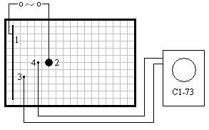 Схема, приведенная на рис. 2, соответствует ситуации, когда изучается поле, создаваемое небольшим металлическим шариком и плоской пластиной. На электроды подается переменное напряжение от генератора сигналов звуковой частоты. Зонды 3 и 4 в процессе работы вносятся в выбранные точки поля. Специальный держатель зонда 4 обеспечивает его перемещение вдоль оси симметрии электрического поля. Зонды подключаются к осциллографу С1-73, с помощью которого измеряется амплитуда напряжения между точками поля при заданной амплитуде напряжения на электродах 1 и 2. Чувствительность вертикального входа осциллографа (в В/дел.) изменяется каскадным делителем напряжения. Его рукоятка установлена в верхней части передней панели осциллографа слева от экрана. С правой стороны экрана установлен переключатель калиброванной горизонтальной развертки электронного луча. Каждому положению этого переключателя соответствует определенное время пробега лучом одного деления горизонтальной шкалы. Соответствующий параметр (в мс/дел., мкс/дел.) считывается по круговой шкале переключателя разверток напротив его указателя. Получение неподвижной картины на экране осциллографа достигается поворотом рукоятки «стабильн.», расположенной на передней панели осциллографа ниже экрана.