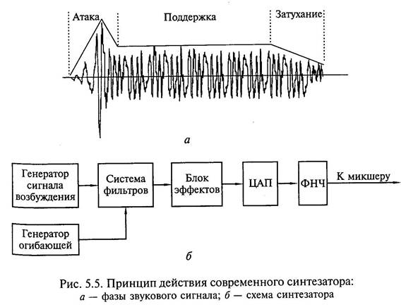 Электромузыкальный цифровой синтезатор звуковой системы позволяет генерировать практически любые звуки, в том числе звучание реальных музыкальных инструментов. Принцип действия синтезатора иллюстрирует рис. 5.5.