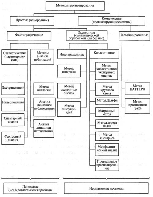 При выполнении прогнозирования в типовую последовательность операций включается: 1) предпрогнозная ориентация на основе системно-структурного анализа объекта; 2) постановка задачи для разработки прогноза — уточнение характеристик объекта, масштабов выпуска или рынка сбыта, установление периода прогнозирования, а также условий, ограничений и ожидаемого гипотетического результата; 3) анализ и установление активных факторов прогнозного фона; 4) формирование информационной базы по объекту прогноза и прогнозному фону (патенты, научно-техническая, экономическая информация и т.п.); 5) разработка прогноза развития объекта и оценка его достоверности с учетом действия факторов прогнозного фона; 6) анализ результатов прогнозирования; 7) выработка рекомендаций по результатам анализа для принятия решений в сфере управления. Специфика проблемы или задачи прогнозирования могут потребовать изменения и дополнения перечисленных операций. В процессе прогнозирования используют два подхода: • индуктивный подход — рассмотрение проблем от частного к общему, т.е. на основании фактических или зарегистрированных данных (эксперимента или развития процесса) об объекте устанавливается тенденция (или закономерность) общего развития объекта, которая и используется при обосновании прогноза; • дедуктивный подход (подход от общего к частному) — определение общих тенденций или закономерностей развития анализируемой области техники, а затем — на основе выявленной общей перспективы — уровней и путей развития отдельных направлений, а также конкретных технических характеристик интересующих в данном случае объектов прогнозирования. Индуктивному подходу в наибольшей степени соответствуют методы поискового прогнозирования, а дедуктивному — нормативного. При поисковом прогнозировании состояние объекта в будущем определяется закономерностями, выявленными по частным результатам опыта (эксперимента) его поведения в прошлом и настоящем. В этом случае прогнозирование осуществляется от имеющегося уровня знаний, а конечные результаты развития объекта составляют содержание прогноза. В свою очередь нормативное прогнозирование ориентировано на то, что задается конечная цель (или закономерность) развития (поведения) объекта в будущем, а содержанием прогноза становится определение частных путей, средств и сроков достижения цели. Прогнозирование в этом случае осуществляется от заданной цели как бы навстречу ходу времени. Современная прогностика располагает большим арсеналом методов прогнозирования (более 150), но ни один из них не может быть признан универсальным. На рис. 2 представлена систематизация методов прогнозирования.