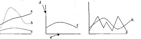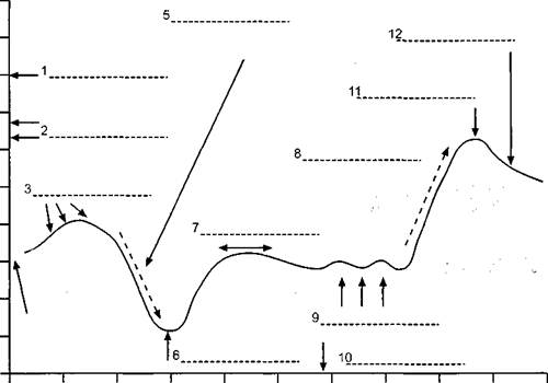 1. Sterling has been rather susceptible to sudden change recently. 2. The Deutschmark showed some improvement on Friday. 3. The yen has made more progress than most European currencies this year. 4. The market makers have been rather aggressive in their buying this morning. 5. Pound trading was thin in Frankfurt yesterday. 6. Cocoa prices reached a high point at midday. 7. Trading of softs was very slow last week. 8. On Wall Street, leading stocks became stronger last month. 9. Silver prices plunged yesterday, closing, 14 pence below the previous close. 10. The dollar moved up and down in London last week. 11. Share prices slid slightly after the resignation of the Chairman. 12. Commodity prices were erratic last week. 13. The level of inflation stayed the same during 1993. 14. Commodities trading improved yesterday after a slow start. 15. A quiet, low trade volume options market was forecast. VII. The Language of Graphs. Match the terminology in the box with the points on the graph below.
