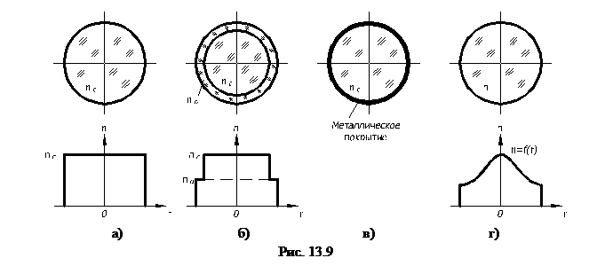 Волоконный световод представляет собой пруток, изготовленный из оптически прозрачного материала (оптическое (ТФ) или кварцевое стекло), чаще всего круглого сечения с полированной боковой поверхностью и торцами. Световоды позволяют передавать на значительные расстояния световую энергию достаточно высокой плотности мощности по любой траектории. Принцип действия основан на полном внутреннем отражении. Луч, падающий на торец световода, проходит сквозь световод, претерпевая при этом многократное полное внутреннее отражение от боковой поверхности (рис. 13.9, а). Для обеспечения лучших условий полного внутреннего отражения на боковую поверхность световода наносится прозрачный материал с меньшим показателем преломления (рис. 13.9, б) или металлический отражающий слой (рис. 13.9, в). Используются также световоды с параболическим распределением показателя преломления по диаметру (рис. 13.9, г) для обеспечения самофокусировки луча вдоль оси световода. Для передачи лазерных пучков большой мощности или изображения используются многожильные световоды – пучки. Изготавливаются световоды наименьшего диаметра 5...6 мкм. При меньших диаметрах качество передачи информации ухудшается из-за явлений дифракции на выходе из световода.