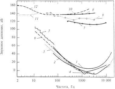 Рис. 1. Кривые порога слышимости и порога неслухового ощущения. По оси абсцисс – частота звука, по оси ординат – звуковое давление, взятое в отношении 0,0002 бара. Кривые 1–5 – определения порога слышимости разными исследователями. Измерения по минимальному слуховому давлению на барабанную перепонку: 1 – Сивиан и Уайт, 3 – Бекеши, 4 – Вэтцман и 5 – Кейбс. Определение по минимальному слуховому полю, измеренному в том участке, где находится голова испытуемого: 2 – Сивиан и Уайт; 6 – Американская Ассоциация Стандартов. Кривые 7–11 – определения верхней границы слухового диапазона, где слуховое ощущение меняет модальность: 7 и 8 – Центральный институт по изучению дефектов слуха, «щекотание»; 9 – Вигель, «осязательное ощущение звука»; 10 – Бекеши, «щекотание»; 11 – Бекеши, «касание»; 12 – Бекеши, «покалывание в среднем ухе».