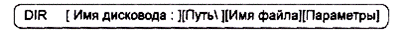 К наиболее часто используемым командам относится команда просмотра содержимого каталога DIR. Работу на персональном компьютере вы, как правило, начинаете с просмотра каталога, чтобы убедиться в том, что нужный вам файл или подкаталог существует. Только после этого вы переходите в ту среду, где будет протекать ваша работа. В процессе работы часто появляется необходимость просмотра содержимого пассивного каталога. Работу с новым диском вы также предваряете просмотром его каталога. Для всех этих ситуаций и многих других воспользуйтесь командой DIR. В зависимости от параметров, допустимых в структуре команды, можно просмотреть записи каталога в стандартной форме или в усеченной форме с выводом только полных имен файлов, а также при большом каталоге выводить его постранично. Формат команды