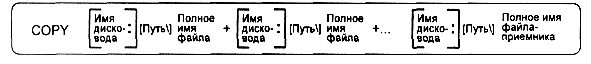 Имена объединяемых файлов перечисляются в команде COPY через знак плюс (+). Имя результирующего файла записывается последним и отделяется от имен объединяемых файлов пробелом. Содержимое результирующего файла представляет собой подсоединенное друг за другом содержимое исходных файлов в соответствии с порядком следования их имен в команде COPY.