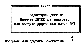 При этом на соответствующую панель выводится вспомогательное окно с перечнем имен доступных дисков. Смена диска на нужный производится клавишами управления курсором либо вводом имени диска и последующим нажатием клавиши <Enter>. Независимо от вида панели процедура отработки данной команды переведет панель в режим отображения текущего каталога заданного диска. При указании имени дисковода, в котором не оказалось дискеты, после небольшой паузы на экране появится окно (рис. 10.3) с сообщением об ошибке и предложением либо повторить операцию после установки диска, либо изменить неверно введенное имя. На панель с содержимым каталога (см. рис. 10.2) выводится перечень имен файлов и вложенных каталогов. Имена каталогов выводятся в верхнюю часть панели заглавными буквами, а имена файлов – строчными вслед за именами каталогов. Если текущий каталог не корневой, то в первой строке этой панели вы увидите две точки.. – ссылку на родительский каталог.