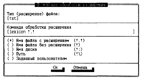 В файле расширений допускается привязка нескольких вычислительных процедур к одному и тому же расширению, и тогда пользователю будет предложено диалоговое окно выбора варианта обрабатывающей программы. Создание или редактирование файла расширений начинается с вызова информационного окна «Обработка расширений» (рис. 10.29). Вызов осуществляется выбором пункта Обработка расширений в меню Команды. На экране появляется окно, содержащее строки файла расширений, если он существует, или пустое, если файл создается впервые. Пользователь может удалить или отредактировать существующие строки, а также ввести новые. В нижней части экрана в строке помощи содержатся подсказки по применению функциональных клавиш для формирования файла расширений.