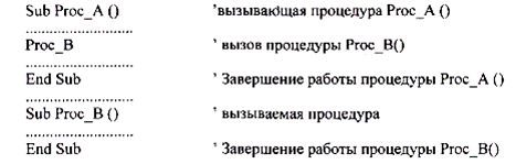 Процедуры имеют стандартное оформление: Sub <имя_процедуры> (аргументы) .................................. тело процедуры (операторы) .................................. End Sub