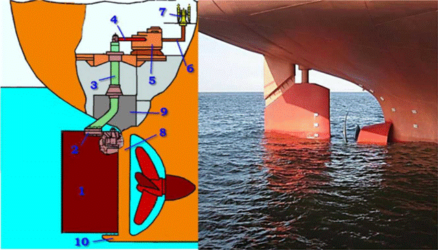 Дизель-генератор, расположенный в машинном отделении судна, вырабатывает электроэнергию, которая по кабельным соединениям передается на электромотор. Электромотор, обеспечивающий вращение винта, расположен в специальной гондоле. Винт находится на горизонтальной оси, уменьшается количество механических передач. Винторулевая колонка имеет угол разворота до 3600, что значительно повышает управляемость судна. Достоинства AZIPOD: - экономия времени и средств при постройке; - великолепная маневренность; - уменьшается расход топлива на 10 - 20 %; - уменьшается вибрация корпуса судна; - из-за того, что диаметр гребного винта меньше — эффект кавитации снижен; - отсутствует эффект резонанса гребного винта. Один из примеров использования AZIPOD ‑ танкер двойного действия, который на открытой воде двигается как обычное судно, а во льдах двигается кормой вперёд как ледокол. Для ледового плавания кормовая часть DAT оснащена ледовым подкреплением для ломки льда и AZIPOD. На рисунке показана схема расположения приборов и пультов управления: один пульт для управления судном при движении вперед, второй пульт для управления судном при движении кормой вперед и два пульта управления на крыльях мостика.