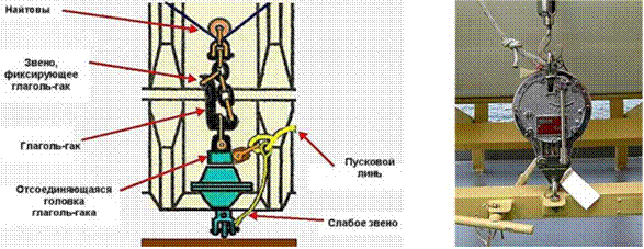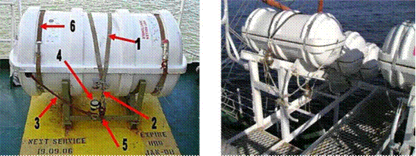 Рис. Схема крепления ПСН к судну: 1 - найтов; 2 - глаголь-гак; 3 - пусковой линь; 4 - гидростат; 5 - слабое звено; 6 - бандажная лента