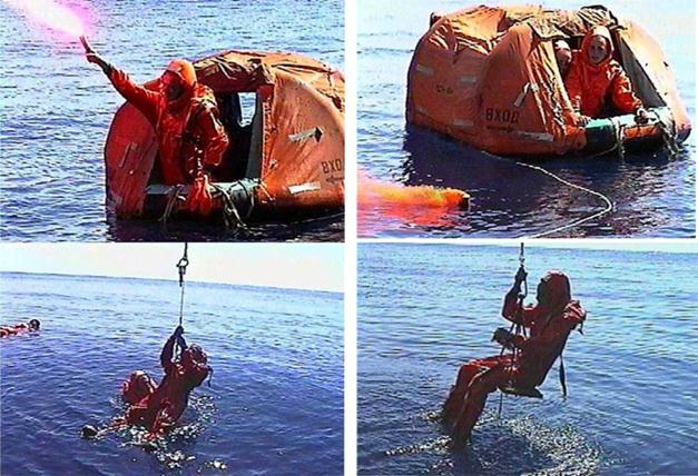 Встречаются конструкции, где слабое звено является частью коренного конца самого пускового линя. Прочность слабого звена мала, чтобы удерживать плот у борта в условиях сильного ветра и волнения. Поэтому при ручной отдаче первое, что необходимо сделать до отдачи найтовов, выбрать из контейнера небольшой участок пускового линя и надежно привязать его выше слабого звена к конструкции судна (изолировать слабое звено). Если не привязать пусковой линь на участке нормальной прочности, то плот будет оторван и унесен. Слабое звено зрительно легко отличить: это может быть более тонкая вставка в пусковой линь или надрез на лине. Спуск ПСН на воду. Посадка в сбрасываемый спасательный плот производится после его раскрытия на воде, что делает более сложной саму процедуру посадки, однако это проще и надежнее в условиях шторма. Прочность сбрасываемого плота должна быть достаточной, чтобы выдерживать его сбрасывание в контейнере с высоты не менее 18 метров и выдерживать многократные прыжки людей на него с высоты не менее 4,5 метров. Краткая инструкция по приведению плота в рабочее состояние и посадке в него наносится на контейнер плота и рядом с местом установки. Порядок спуска ПСН на воду и посадка в него предусматривает следующие действия: - освободить найтовы; - вытолкнуть плот за борт. Для высокобортного судна не рекомендуется сбрасывать плот при крене свыше 15° со стороны вышедшего из воды борта. Допрыгнуть до воды, не касаясь борта, в этом случае маловероятно, а соскальзывание по вышедшему из воды борту, обросшему ракушками, может привести к серьезным травмам; - вытянуть из контейнера пусковой линь и сильно дернуть; - раскрывшийся плот подтянуть к борту и закрепить линь. Если плот раскрылся днищем вверх, то на днище плота имеются специальные лямки, взявшись за которые руками и упершись в край днища ногами, можно плот перевернуть в нормальное положение. Так как плот имеет большую парусность, то перед переворачиванием его необходимо повернуть так, чтобы оказаться с подветренной стороны. В этом случае ветер будет помогать переворачивать плот; - переместиться в плот, стремясь попасть в него сухим: - можно прыгать на плот с высоты до 4,5 метров, если есть уверенность, что в нем нет людей; - можно спуститься по штормтрапу; - можно спуститься по спасательному шкентелю с мусингами; - можно прыгать в воду рядом с плотом, а затем забраться в плот; - помочь другим спасающимся забраться в плот (использовать спасательное кольцо с линем из аварийного снабжения плота). После того, как все спасающиеся оказались на плоту или в воде, но держащимися за спасательный леер плота, необходимо отойти от тонущего судна на безопасное расстояние, для чего нужно: - отрезать пусковой линь. Нож находится в кармане на тенте плота у места крепления линя; - выбрать плавучий якорь; - подтянуть водяные карманы; - использовать весла из аварийного запаса.