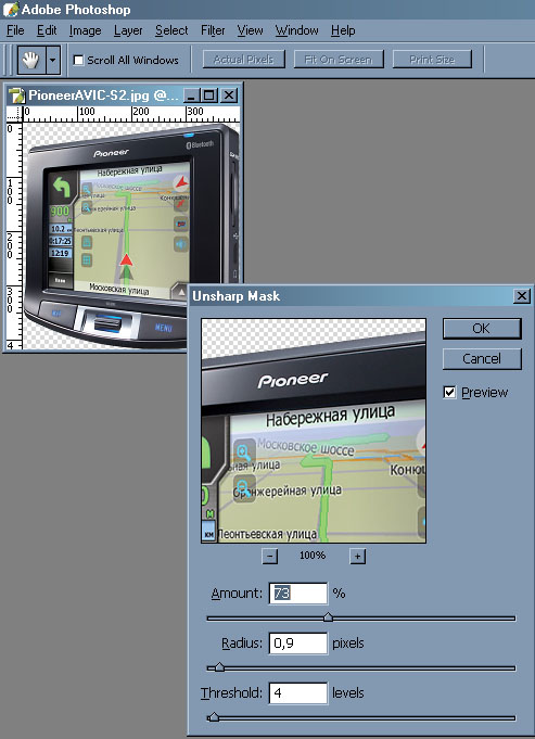 В таком размере нам эта картинка не нужна - слишком большая. Сделаем ее меньше, прикинув отношение к ширине и высоте баннера. Пожалуй, могут пригодиться два размера (флаш отвратительно масштабирует картинки - обходом этого момента нам еще придется заняться): на 400 пикселов по ширине (не забыв сразу записать в psd-формат с соответствующим именем) и на 200. Для второго случая нам понадобится ее немного обработать фильтром "UnsharpMask" для повышения четкости изображения.
