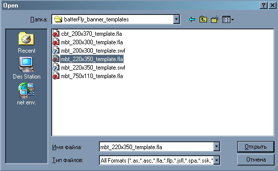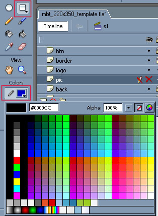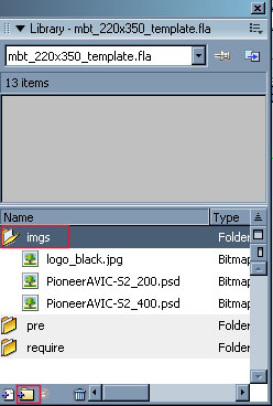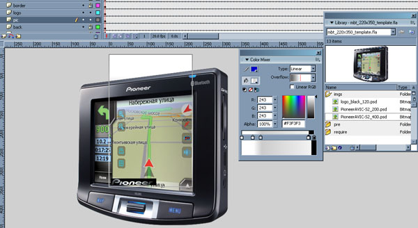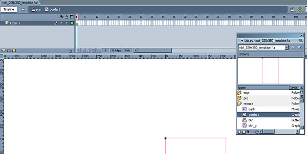 Для работы в таком формате, стандартном для этого постоянного заказчика, есть у меня небольшой набор темплейтов на несколько стандартных размеров. В каждом из них определены уже нарисованы бэкграунд, "кнопка" (целиком прозрачная), рамка (border) - ее наличие в баннере зависит от ТЗ, ведь она может быть выведена и с помощью css в том HTML-layer-е/таблице, в которой будет стоять баннер на сайте, и "двойная" рамка будет грубой ошибкой, но в данном случае рамка нужна, - прелоадер и скрипт, управляющий кнопкой.Также в этом темплейте уже есть слой для ActionScript (всегда удобнее и грамотнее создавать отдельный слой для AS - тогда ключевые кадры в нем можно создавать в любом месте анимации, да и удобнее выбирать кадры с AS - гарантированно не будет ничего случайно сдвинуто) и добавлено сотни три фреймов в основной сцене, а в конце прописан "stop()" в ключевом кадре. Нам нужно будет многое изменить в темплейте, и просмотрим мы все, что в нем имеется, так что Вам, думаю, будет нетрудно его повторить. Я же открываю свой темплейт - и мы двигаемся дальше.
