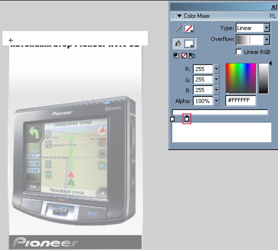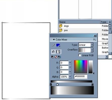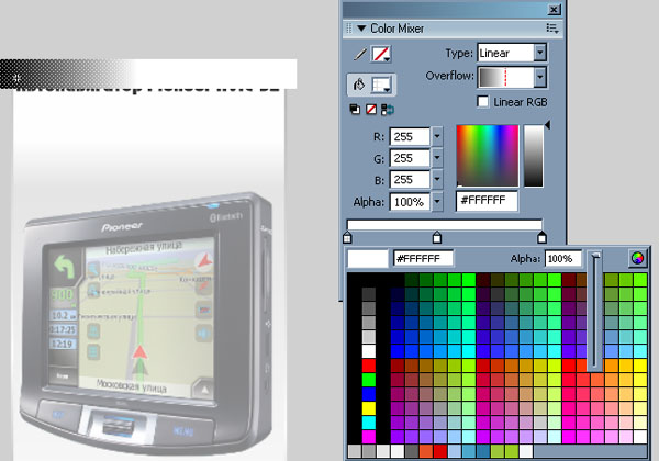 Выбираем (инструментом "стрелка" (V), конечно) прямоугольник-фон, и, если не открыт, открываем ColorMixer (Shift+F9). В ColorMixer создаем серый с черным градиент: