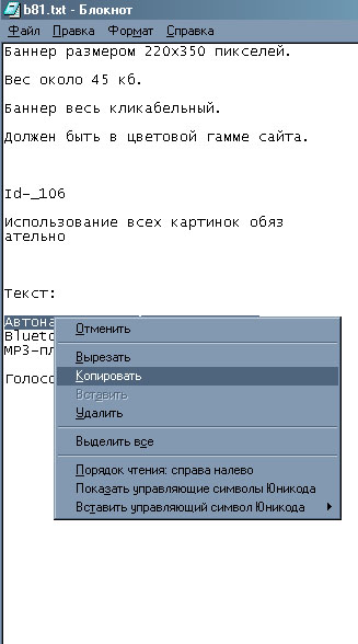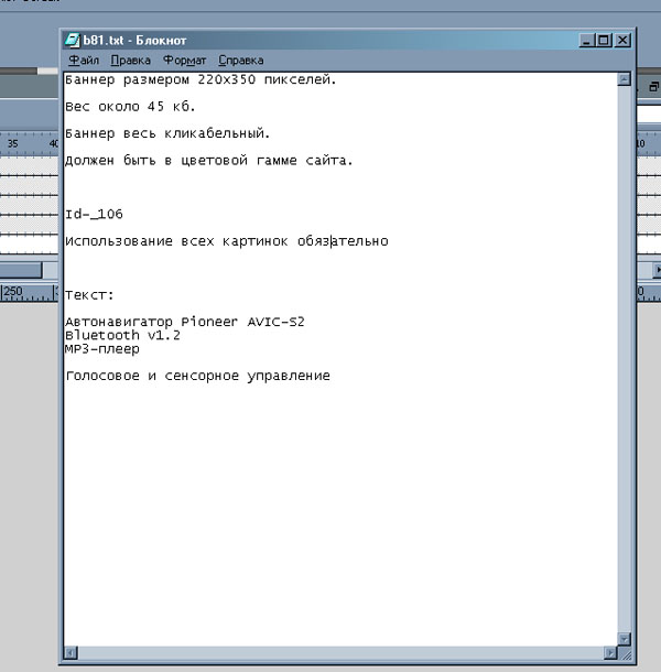 Тема: Создание электронного баннера программного обеспечения отраслевой направленности. Цель: формирование навыков создания рекламной продукции. Оборудование: персональный компьютер, программное обеспечение для работы с графикой. Краткое теоретическое обоснование: Поскольку урок является фактически "стенограммой", есть в нем и обычные в такой работе "шаги назад", и поправки по ходу дела, - в общем, он несколько отличается от "гладкого выполнения задания". С другой стороны, некоторые движения, вроде конвертации шейпа в мувиклип/разгруппировки, выполнение "наплыва" MotionTween-ами, и т.п., в такой работе должны быть доведены до полного автоматизма. Что, кстати, в равной мере пригодится и в просто творческой работе - ведь хорошо бы решать творческие задачи, а не занимать голову мелкими вопросами вроде "где ж эта кнопка", верно? Как и в предыдущем уроке, о необходимости периодически сохраняться я более упоминать не буду - Ctrl+S лучший друг любого компьютерщика, а дизайнера тем более. Так же я буду считать, что если я один раз подробно расписал, напр., как делается MotionTween, то второй раз я могу этого не расписывать, а просто написать - "делаем M. Tween с такого-то по такой-то кейфрейм в таком-то слое" - в особенности если на эту тему в разделе есть отдельный(е) урок(и). Ибо, если я не могу так считать - то занятие наше останется пустою забавою... Поехали. Любой заказ начинается с получения исходных материалов. В данном случае требования заказчика следующие: